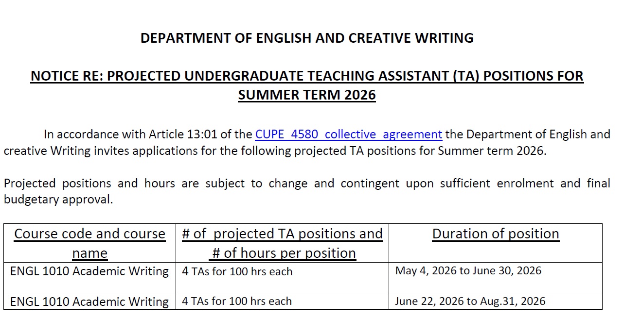 Teaching Assistants are unionized and governed by a Collective Agreement (CUPE 4580).