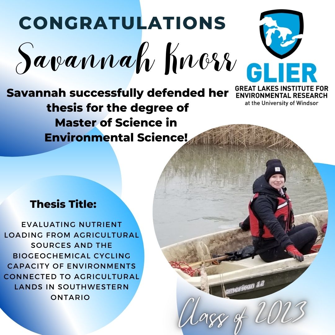 Savannah Knorr recently defended her M.Sc. dissertation: Evaluating Nutrient Loading from Agricultural Sources and the Biogeochemical Cycling Capacity of Environments Connected to Agricultural Lands in Southwestern Ontario.
