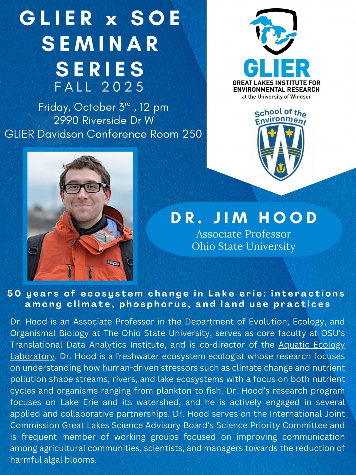 Please join us on Friday, Oct. 3, 2025 at 12pm in the GLIER Davidson Conference Room (Rm. 250) where we will welcome Dr. Jim Hood from Ohio State University. Dr. Hood's seminar is titled “50 years of ecosystem change in Lake Erie: interactions among climate, phosphorus, and land use practices”. Everyone is welcome, no registration is required.