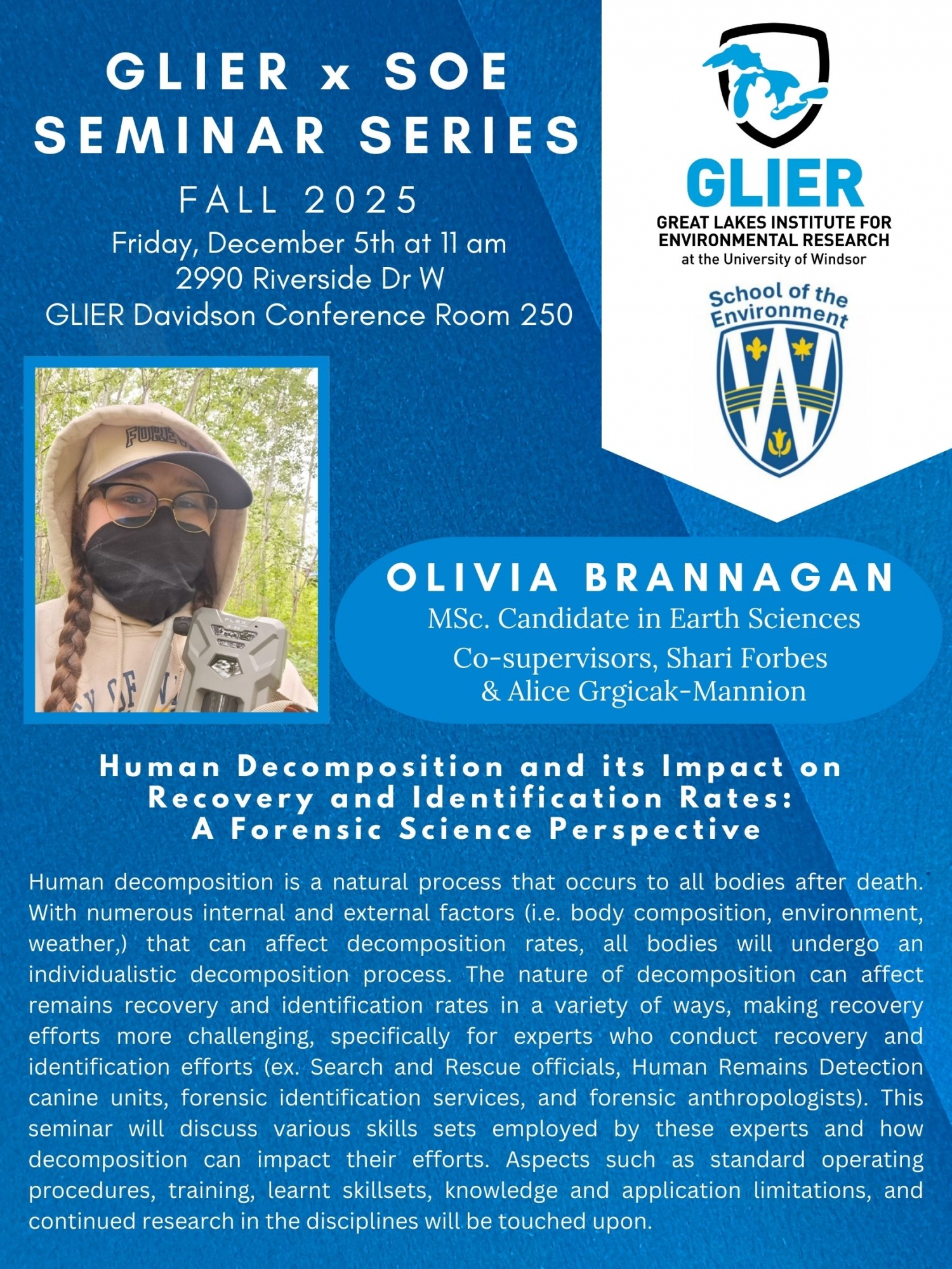 The GLIER X SOE seminars continue this Friday, Dec. 5 at 11:00 am in the GLIER Davidson Conference Room (GLIER 250). Guest speakers are Emma Raoux and Olivia Brannagan. Both are MSc candidates in the Earth Sciences program and supervised by Shari Forbes and Alice Grgicak-Mannion.
