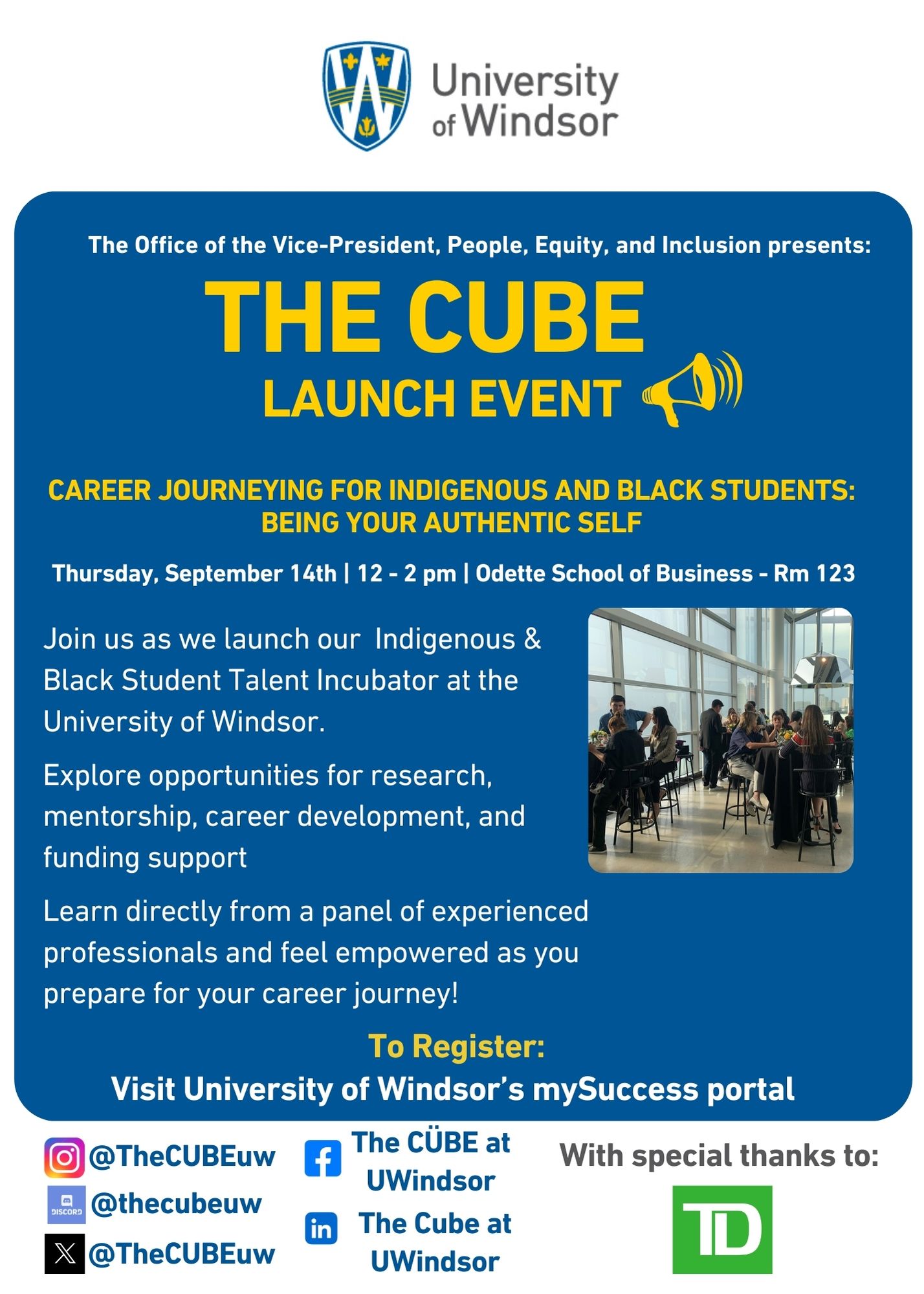 The Cube (a talent inCUBE-ator) is a groundbreaking, transformative initiative aimed at breaking down the formidable barriers Indigenous and Black scholars encounter in academia, amplifying their voices and fostering an environment of growth and nurturing. Join us for the launch event, which features a panel of experienced industry leaders from the TD Bank Group (TD). This will be an engaging session for University of Windsor Students across disciplines. Students will have an opportunity to engage directly with industry leaders, gain insight and prepare for their upcoming career journeys.