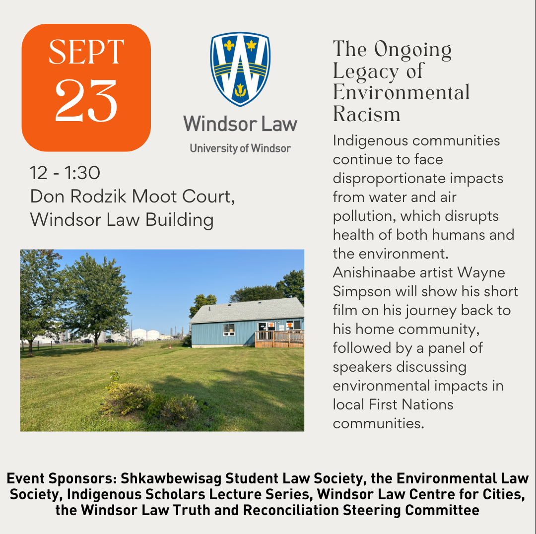 This event is brought to you by the Shkawbewisag Student Law Society, Environmental Law Society, Indigenous Scholars Lecture Series, Windsor Law Centre for Cities, and the Windsor Law Truth and Reconciliation Steering Committee.
