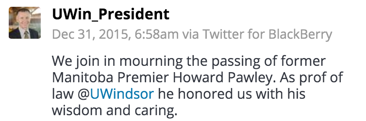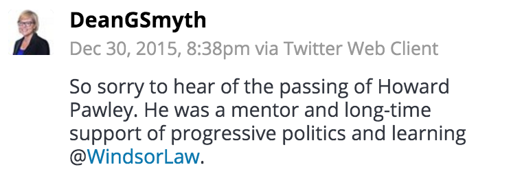 The Faculty of Law community mourns the passing of Howard Pawley, former premier of Manitoba and professor of law at the University of Windsor.