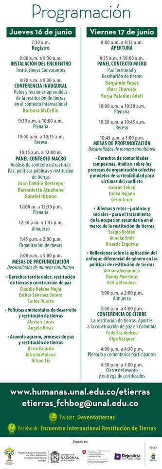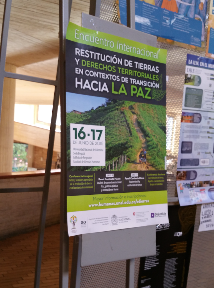 On 16-17 June, Dr. Anneke Smit participated as an invited speaker in the conference “Restitution of Land and Territorial Rights in the Context of the Transition to Peace” at the Universidad Nacional de Colombia in Bogota. Dr. Smit presented her research on the legal and social position of secondary occupiers of land and housing during processes of post-conflict land restitution. She reflected on possible lessons for Colombia’s nascent restitution process.