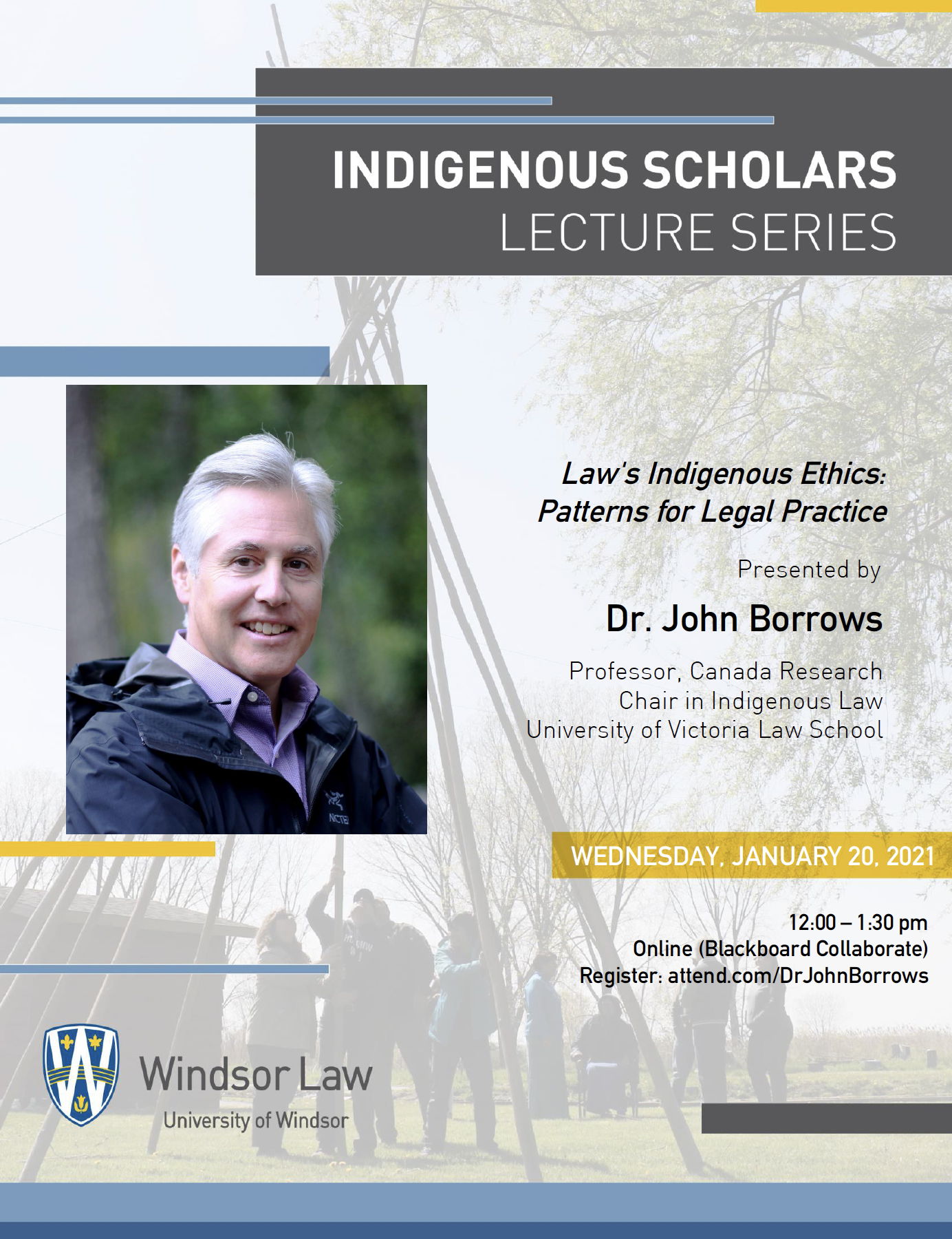 Join us for the Indigenous Scholars Lecture Series with guest speaker Dr. John Borrows, University of Victoria Faculty of Law, to discuss and further build on your knowledge of Indigenous Legal Orders. This event is hosted by the Indigenous Legal Orders Institute at Windsor Law.