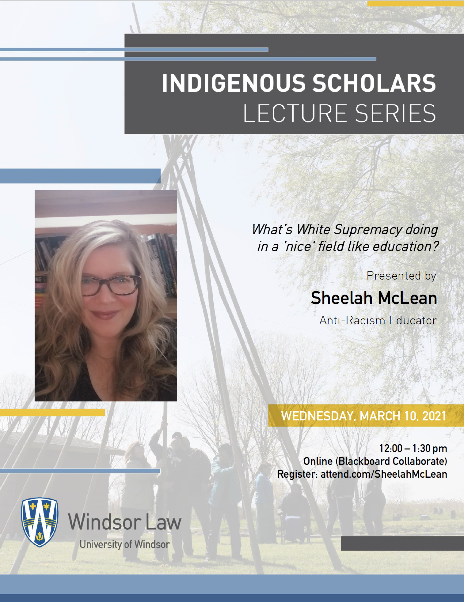 Join us for the Indigenous Scholars Lecture Series with guest speaker Sheelah McLean, an anti-racism educator, to discuss white supremacy in the field of education. This event is hosted by the Indigenous Legal Orders Institute at Windsor Law.