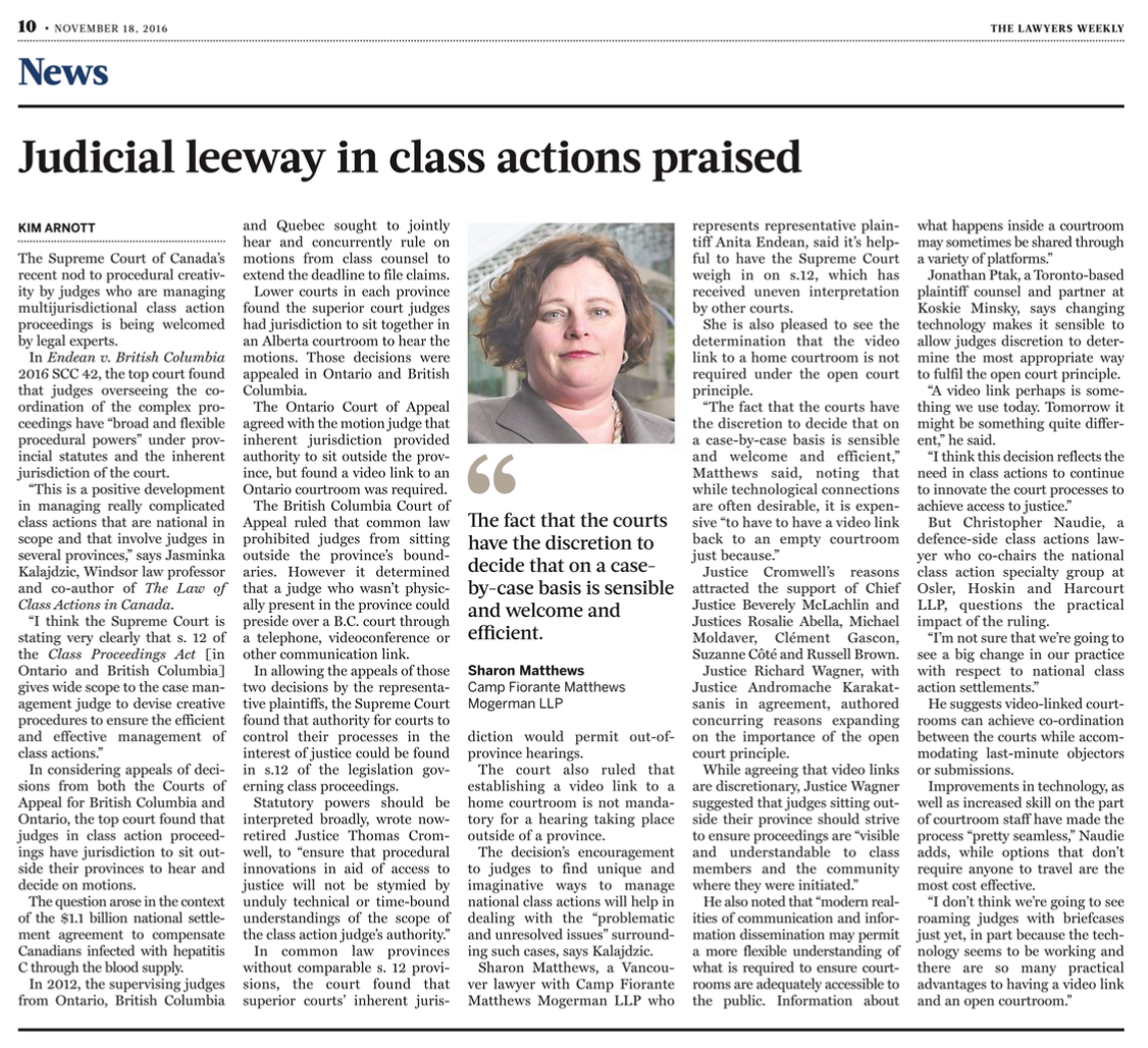 Professor Jasminka Kalajdzic commented on the Supreme Court of Canada's recent decision on the powers of judges to sit outside of their jurisdictions in an article by Kim Arnott in The Lawyers Weekly entitled, "Judicial Leeway in Class Actions Praised," on November 18.