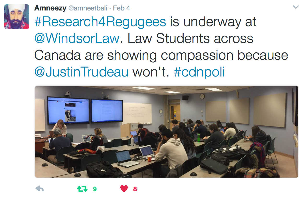 This weekend, Windsor Law students joined law students from across Canada to take part in a research marathon to assist refugees impacted by ban by U.S. President Donald Trump's recent executive orders.
