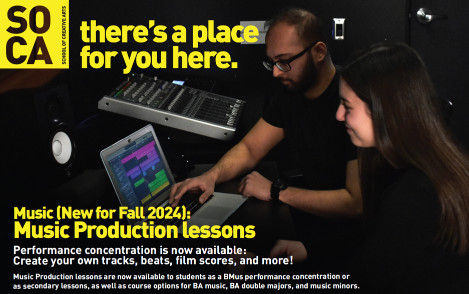 Music Production lessons are now available to students as a BMus performance concentration or as secondary lessons, as well as course options for BA music, BA double majors, and music minors.
