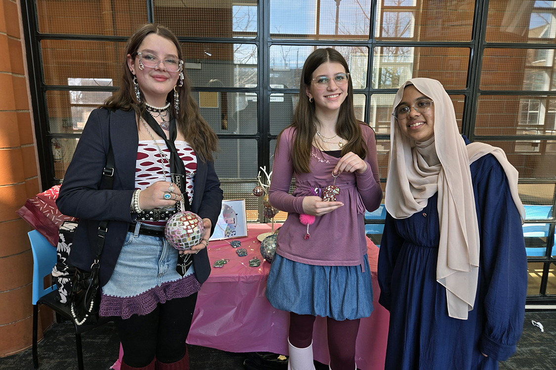 Reflective Rave owners Hadiya Haris, Mila Tagarac and Ayden Rhyno of Tecumseh Vista Academy receive the award for Best Pitch at Market Day. (VICTOR ROMAO/University of Windsor)