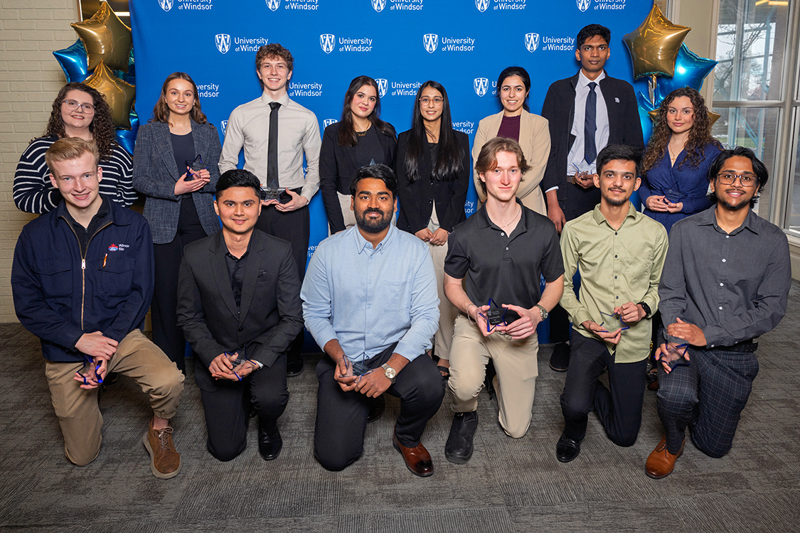 Recipients of the Rising Star Award from the summer and fall 2025 semesters pose during the University of Windsor’s Co-op and Experiential Learning Awards ceremony on April 1, 2026. Back row, from left: Amanda Muzzatti, Sophia Acampora, Cameron Anderson, Rachelle Dib, Happy Dineshkumar Mehta, Jasmine Kaur Gill, Hein Min (John) Htun and Bianca Toma. Front row, from left: Lucas Pineo, Akshat Rami, Shanmugamanikkam Subramaniyam, Tyler Ballard, Vansh Jignesh Patel and Mohammed Parvez. (PETER MARVAL/University of Windsor)