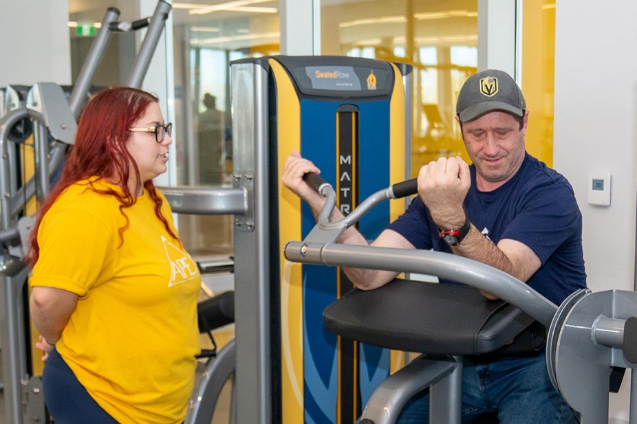 Mikala Jones leads Seth Sugarman through weight training during an Adaptive Physical Exercise session in the Toldo Lancer Centre.