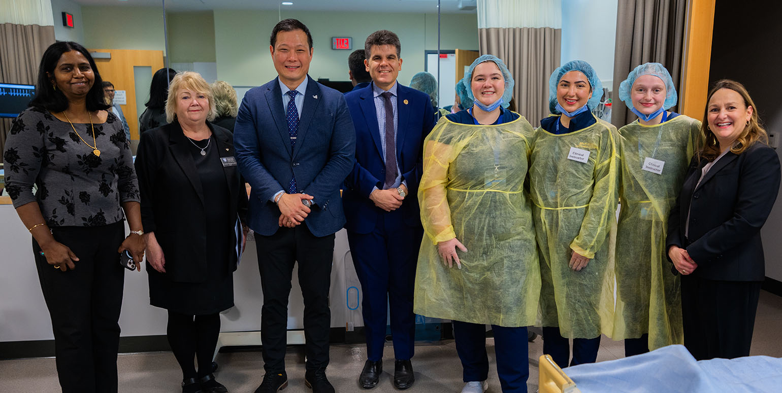 VP Research and Innovation Shanthi Johnson, Dean of Nursing Debbie Sheppard-LeMoine, Ontario Minister of Long-Term Care Stan Cho, Windsor-Tecumseh MPP Andrew Dowie, third-year students Alexa Finn, Isabel Cristofari, and Jana Duric, and Associate VP External Judy Bornais in nursing’s simulation lab.