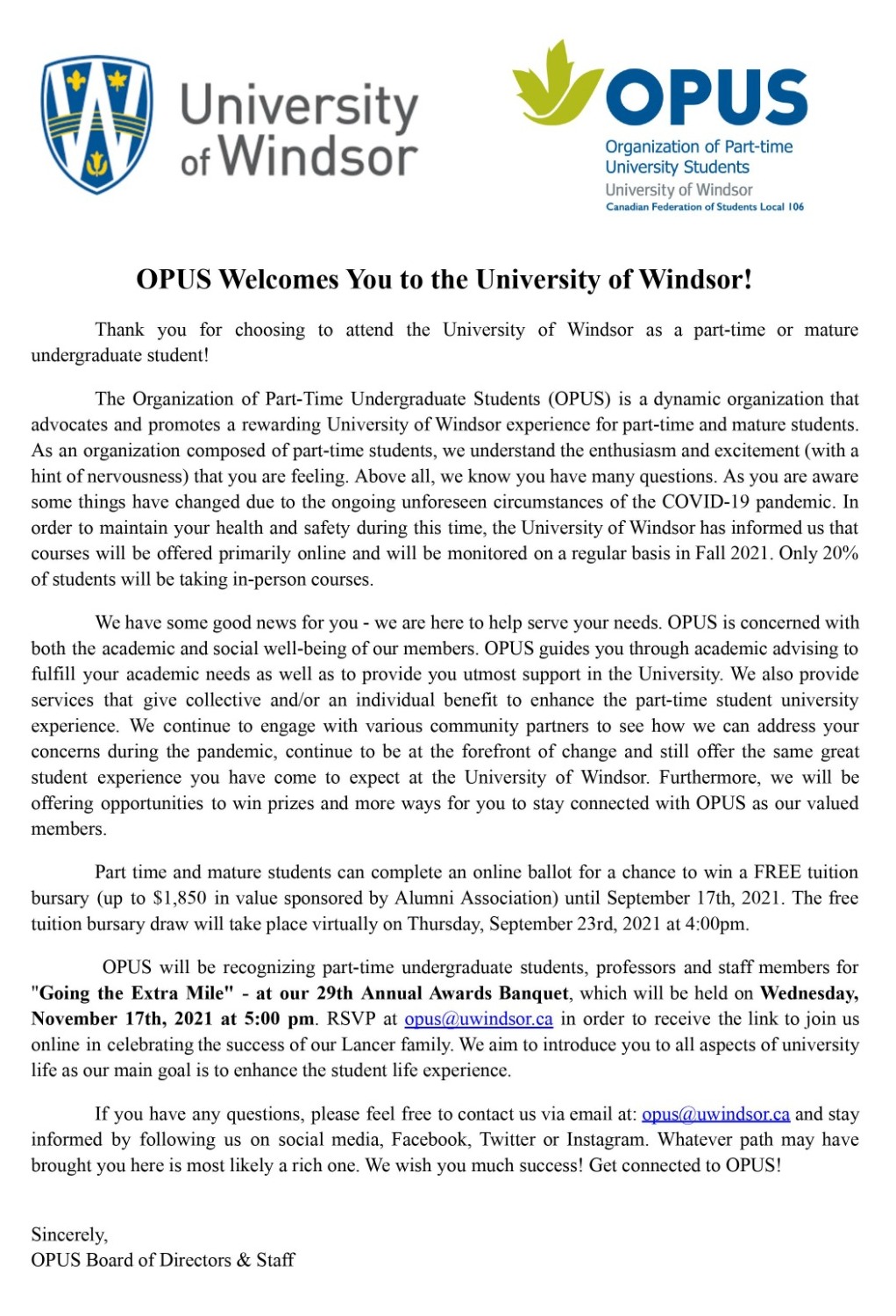 Part-time and mature undergraduate students can come to our office to get their free gift package! during our office hours, from 9:30 am to 5:00 pm Mon to Thurs or schedule an appointment by emailing opus@uwindsor.ca. Please note that there is a limited quantity, while supplies last.