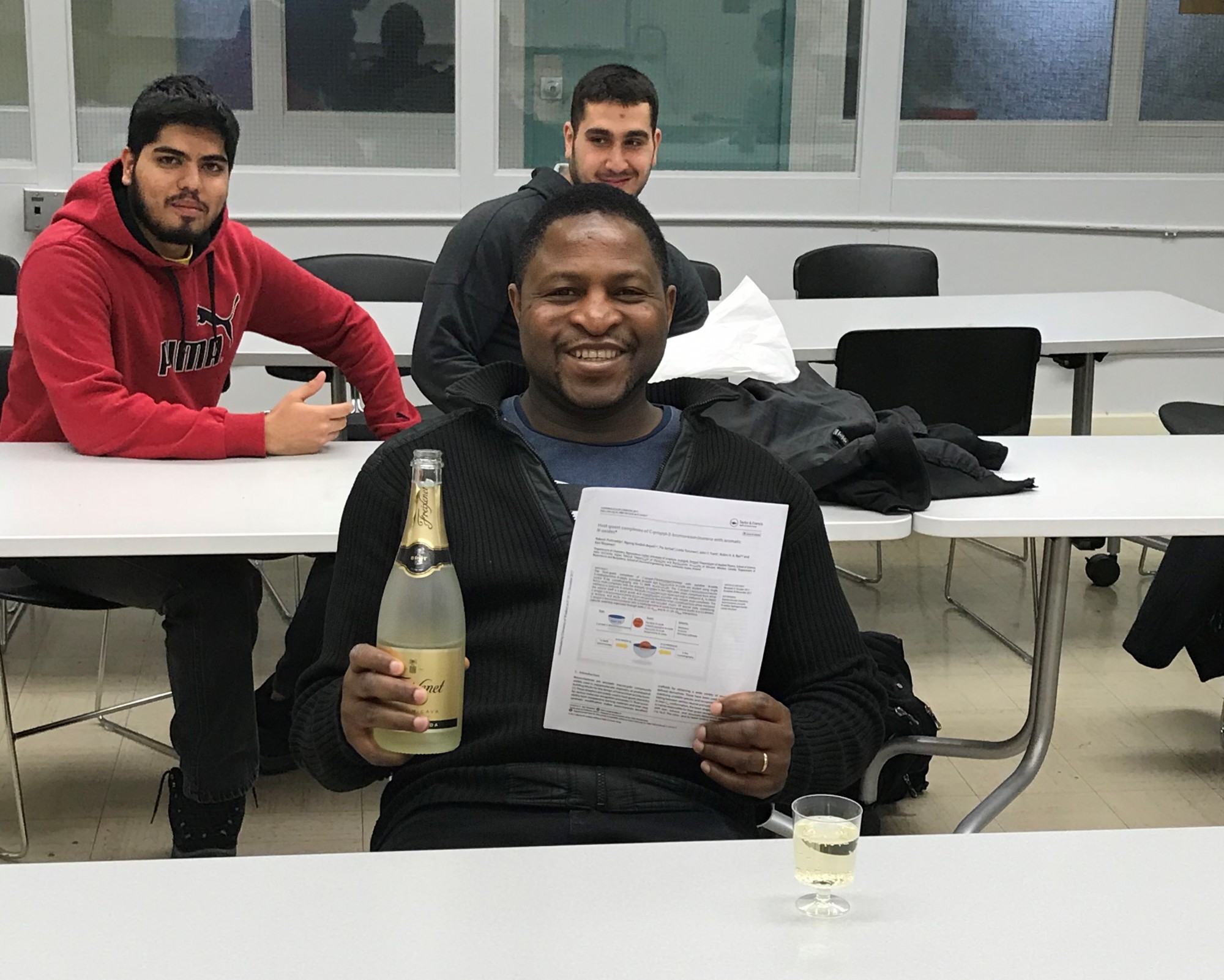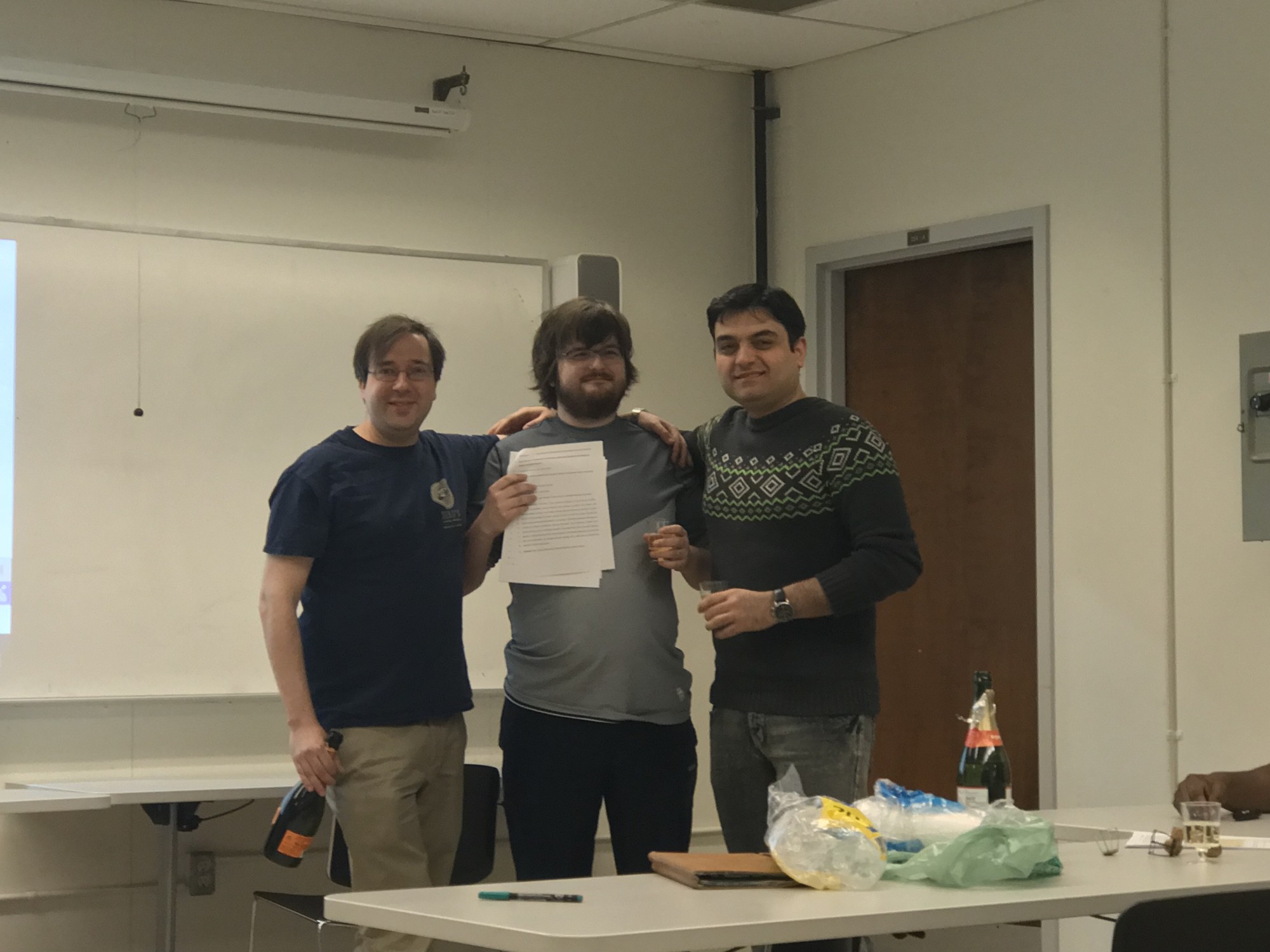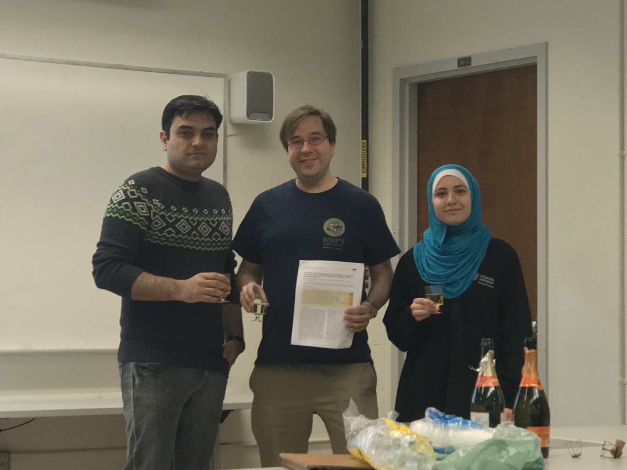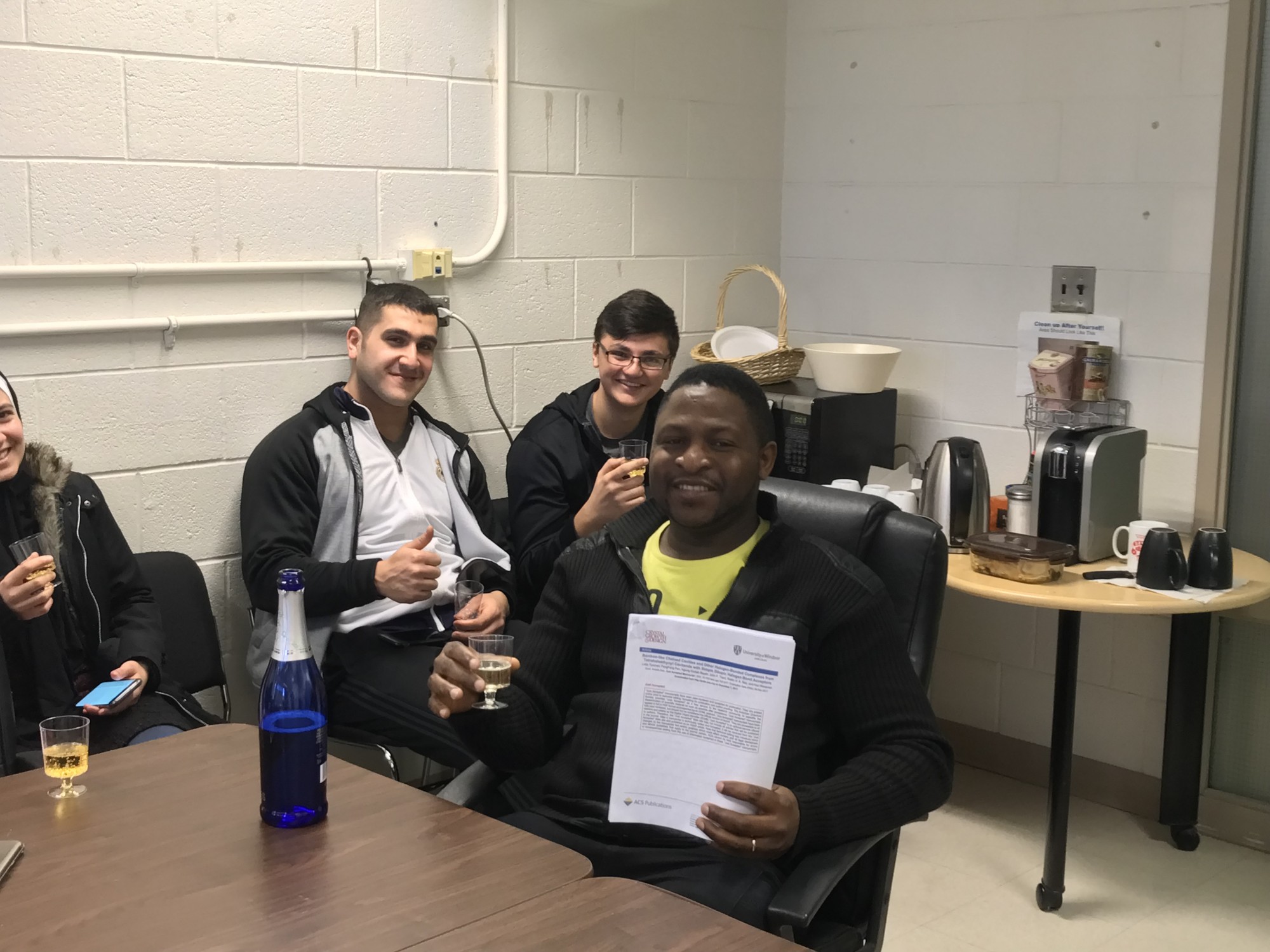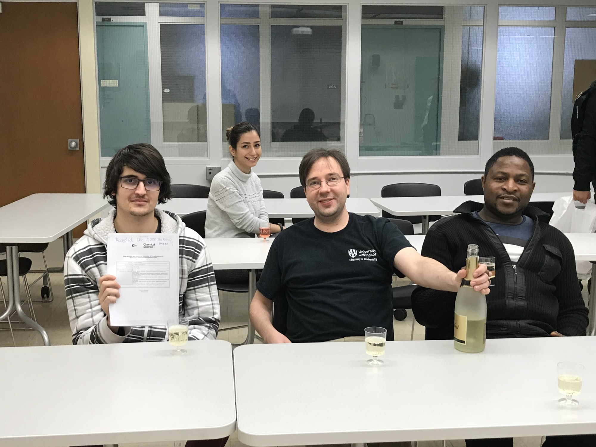 Dr. S. M. Nazanin Taimoory (not shown-other commitments), Mr. Dan Meister (with accepted manuscript), Me (with bottle)!!, Dr. Kodiah Beyeh (with glass): Chem. Sci. 2017, December 15, 2017.