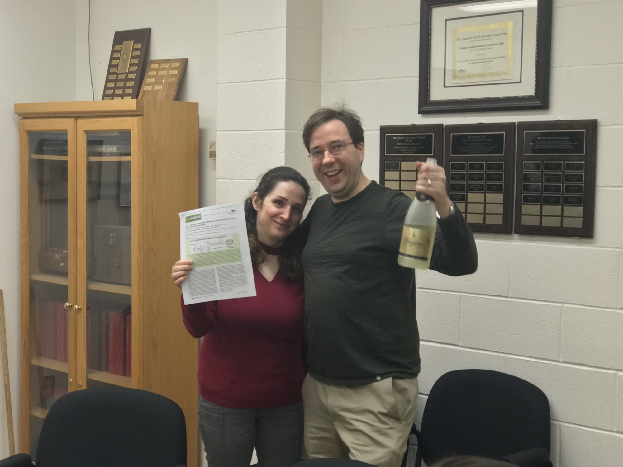 Dr. Nazanin Taimoory (paper) Dr. John Trant (unopened bottle) Journal of Molecular Liquids, 2018, June 7, 2018 (Taken in the Trant Team office in front of the floor-to-ceiling window). We look very happy to get this one published (we are...very happy. Ask me about it sometime).
