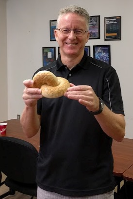 Steve explains the concept of interlocked molecules (a [2]catenane) using bagels at a special breakfast celebrating the Nobel news.