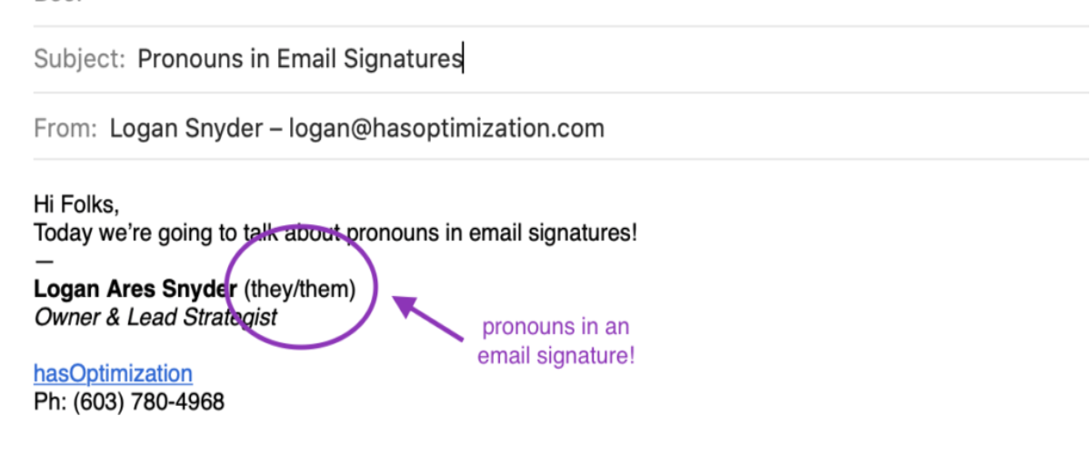 - Adding self-expression to your written & social identity: add pronouns to email, text, social media, etc.
