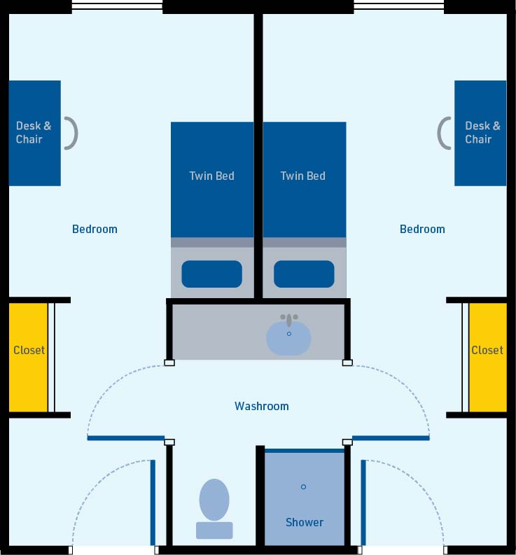 - Full bathroom (shower, toilet, sink and under sink cabinet) shared by adjoining single room. Bathroom doors can only be locked when in use.
