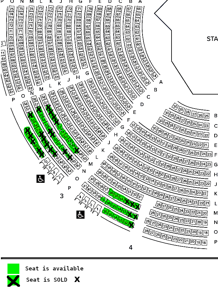 Each seat has a letter that defines its row designation and the seat number. Please make a selection(s) from the seating map above, noting it's row and seat number and look up its price in the table below.
