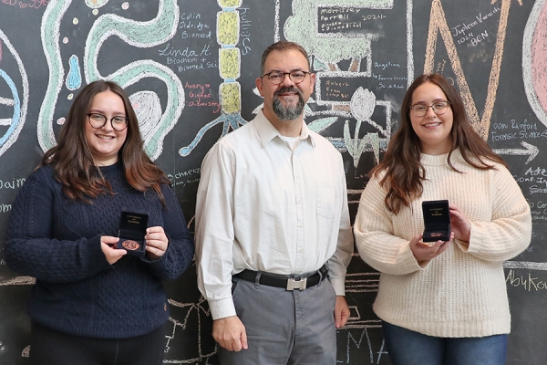 Science Society vice-presidents Lindsey Boshart and Lauren Pandolfi flank teaching award winner Otis Vacratsis.