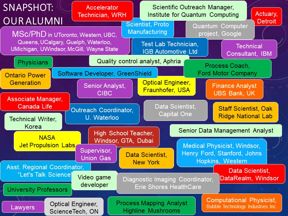 Students studying Physics at the University of Windsor have an exciting opportunity to gain skills that will prepare them for satisfying and rewarding careers worldwide. Our programs are designed to prepare students for leadership positions in both academic and industrial research, and to meet the employment and competitive needs of the Canadian high-technology industry. Our department continuously implements strategies to ensure students are prepared for new and exciting opportunities before them.