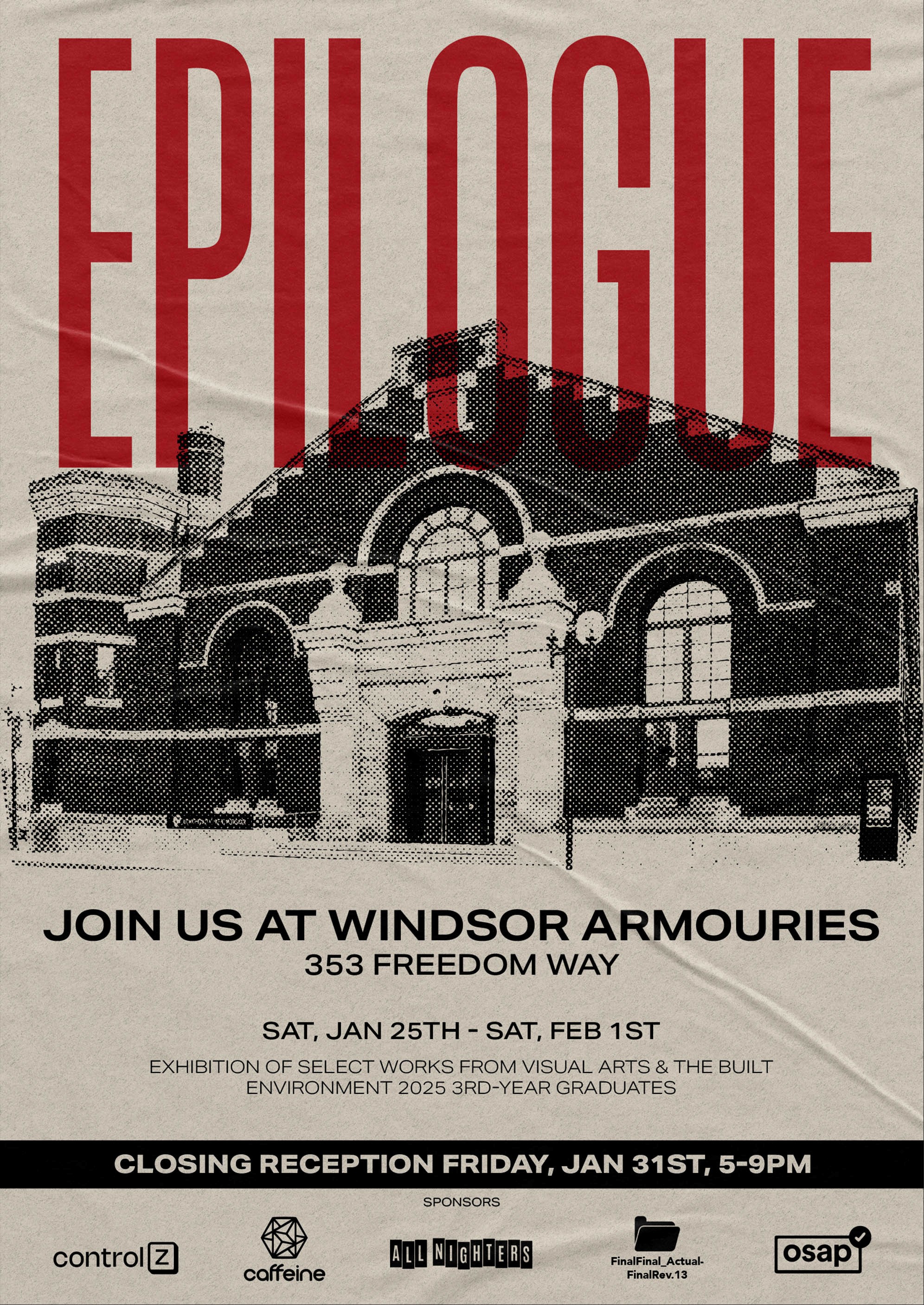 The Visual Arts and the Built Environment (VABE) students are pleased to invite you to EPILOGUE, our third-year graduating exhibition. The event will be held at The School of Creative Arts (SOCA) Gallery, located at the Windsor Armouries, from January 25th to February 1st, 2025.